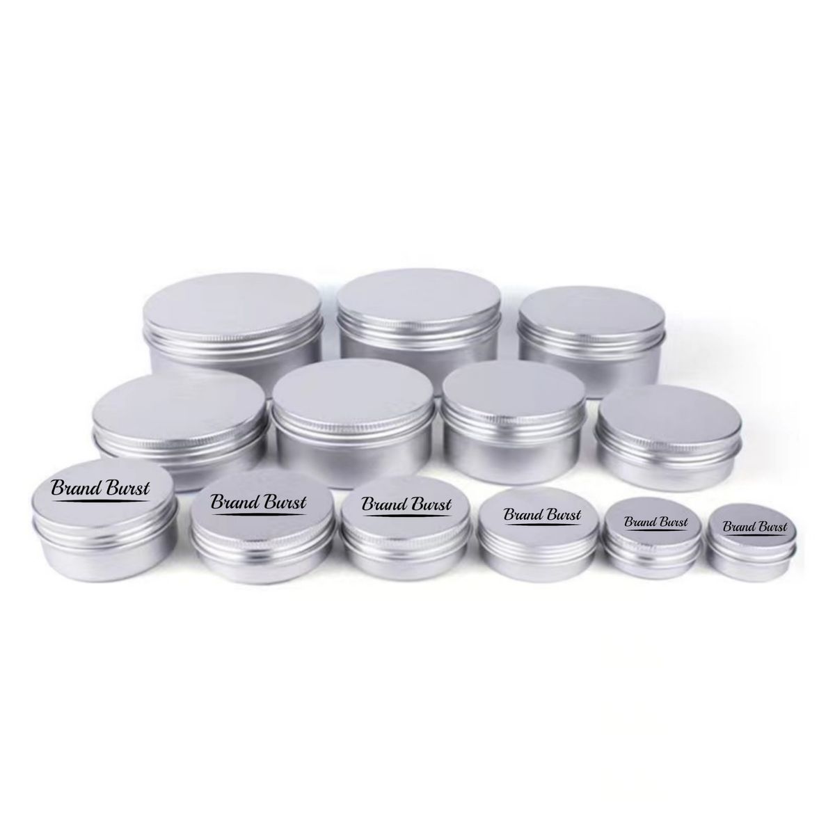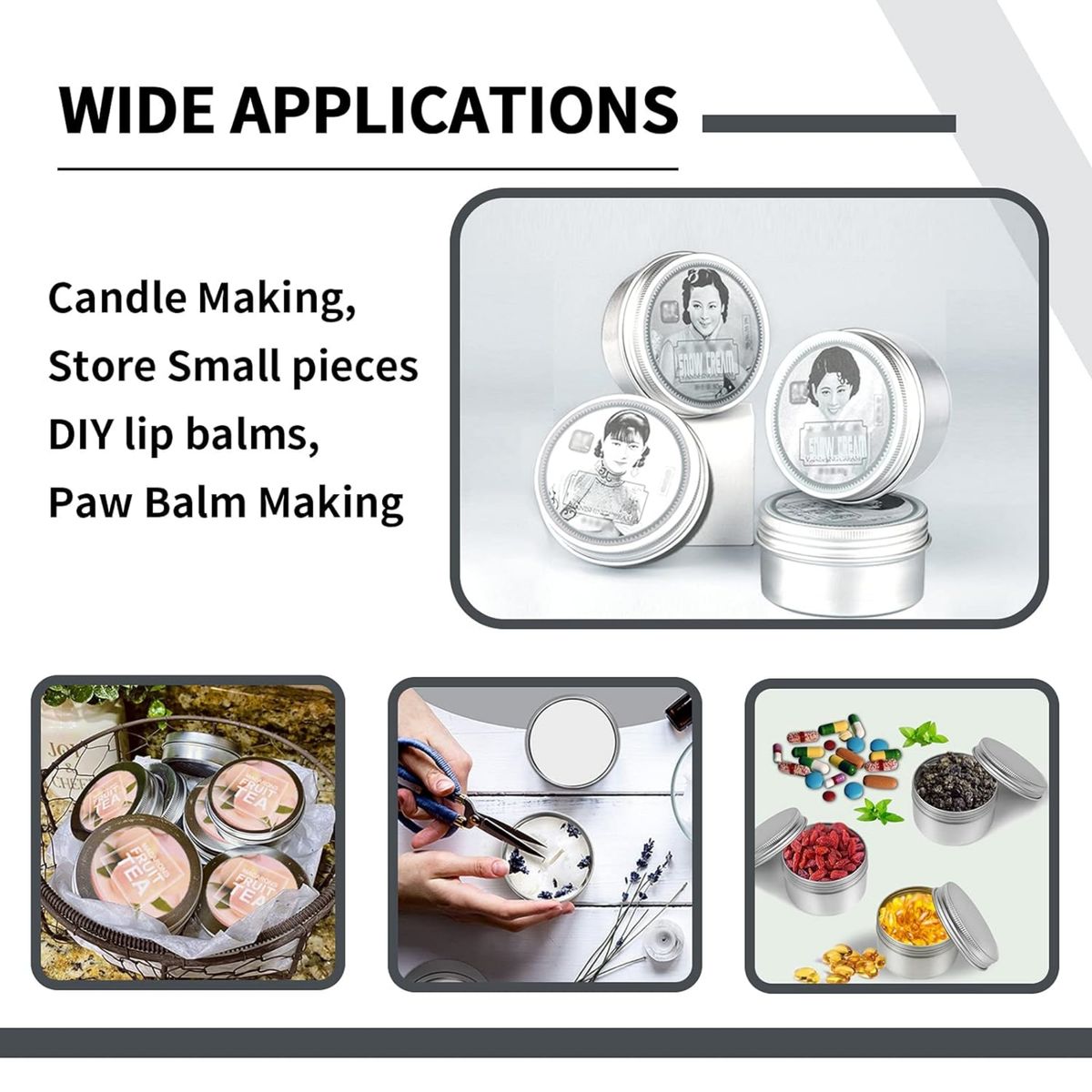 Durable aluminum containers with tight screw lids prevent leaks for storing spices, candies, lip balm, candles, and more. 4 ounce capacity and 2.75 x 2.75 x 1.57 inch size for multipurpose storage needs. Suitable for handmade products like lip balms, lotions, soaps, salves, candies, coins, herbs and spices. Screw top lids provide airtight sealing to keep contents fresh without risk of spilling. Customize LOGO and pattern is available.