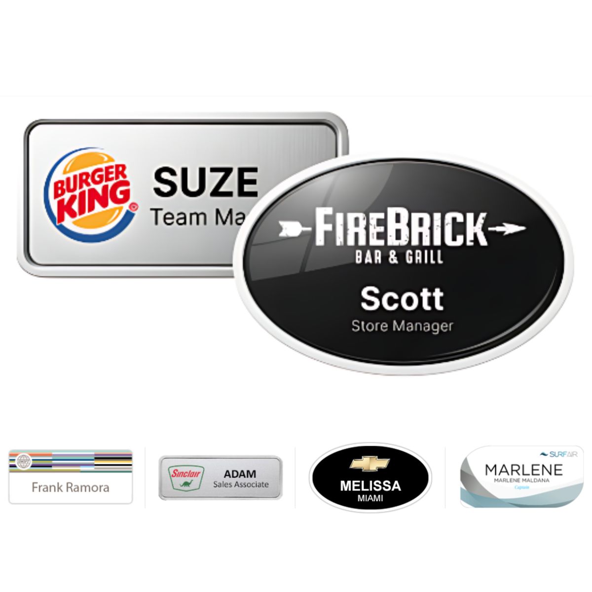 Made in the USA! Lightning fast turnaround. Our full color digitally printed name badge comes on white, brushed silver, or brushed gold. Standard sizes listed. Indiviually personalized with no limits on lines of text. Custom colors, sizes, and full bleed printing available at no extra charge. Our badges come on a .060(1/16"), extra thick and durable plastic. Prints are protected with clear coating and overlays.