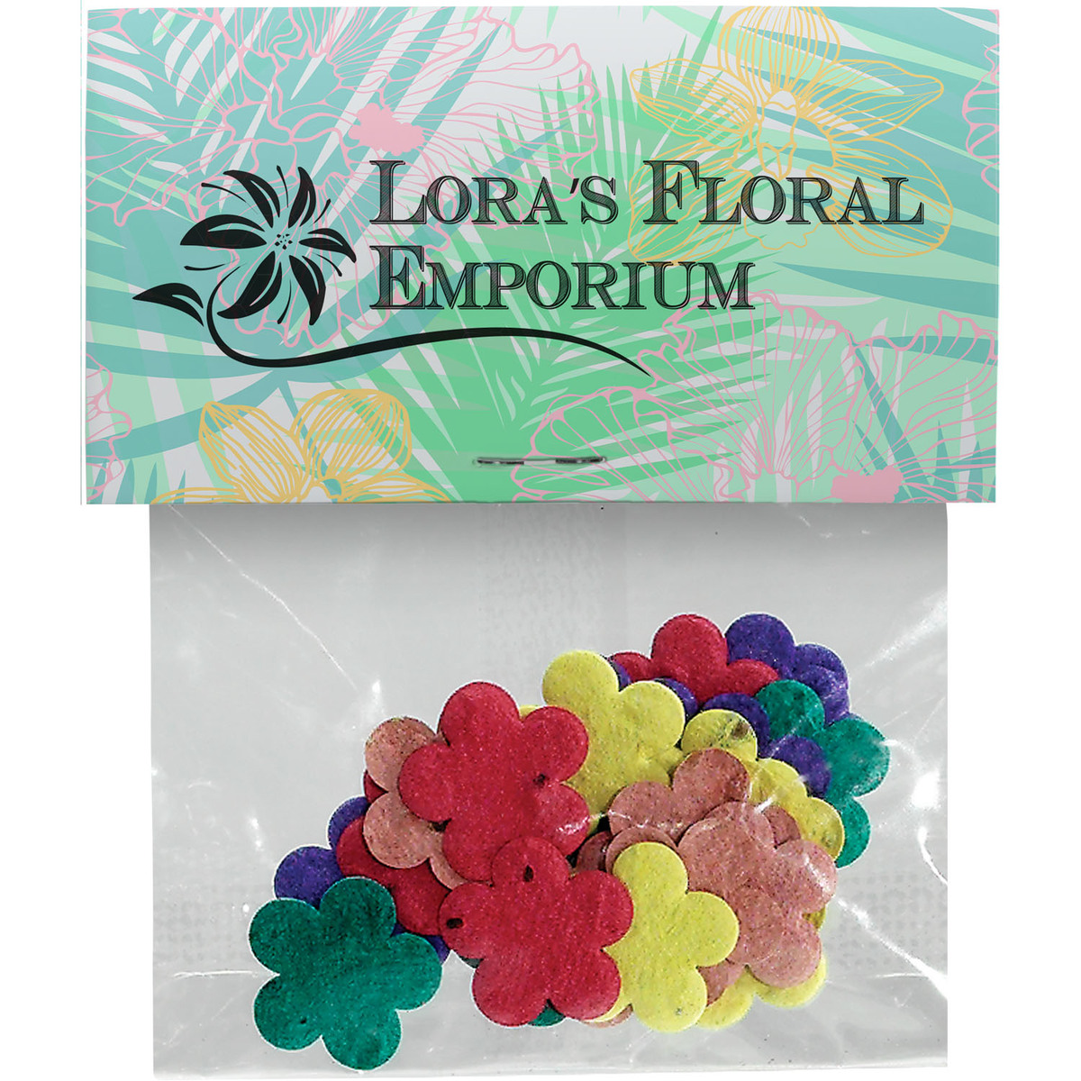 Seeded confetti in fun shapes. Whimsical and elegant. Perfect as favors for weddings, fund raisers, parties and more! Individual packet contains a handful of multicolor shapes. Your full color message on front and planting instructions on back.